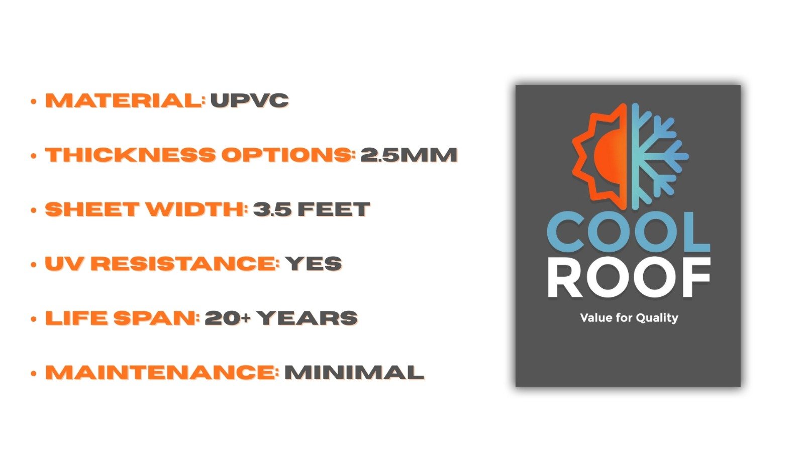 Crafted from premium UPVC, Cool Roof ensures complete resistance to rust, corrosion, and chemical degradation, making it ideal for coastal, industrial, or humid environments.